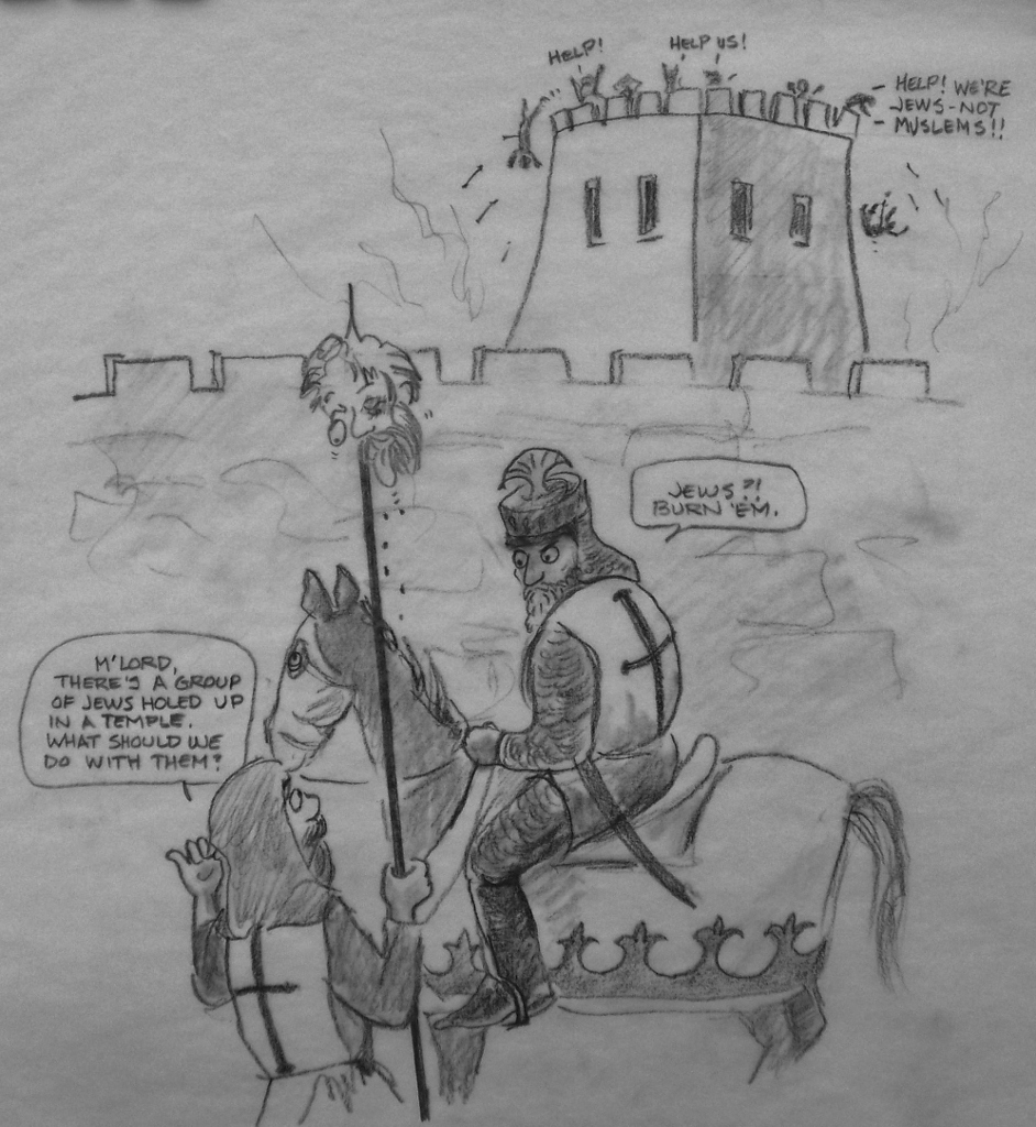 | The knights in their shining armor didn't just rape, plunder, and kill. They beheaded, mutilated, dismembered, disemboweled, castrated, hanged or crucified every man, woman and child in the entire city - Muslims, Jews, and likely some Christians as well. Only a handful were allowed to escape to tell their woeful tale. The Turks, in their worst behavior never came close to such carnage. |