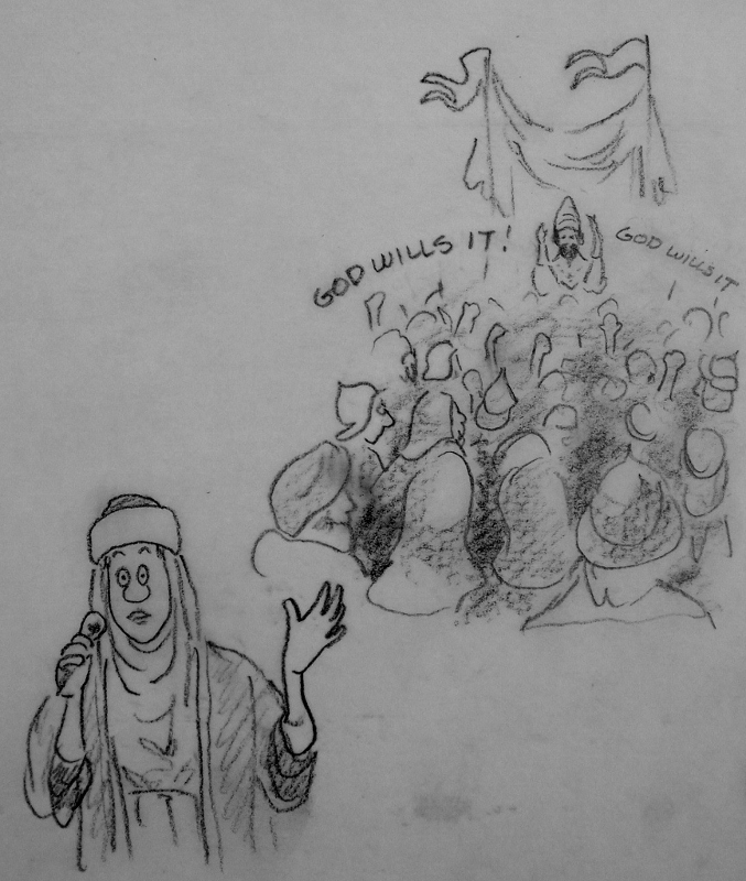 O bravest of knights, descendants of unconquered ancestors etc, etc...take up thy weapons and go forth and rape, pillage and kill...wrest that Holy Land from the wicked infidel and make it your own! You shall be rewarded with much land and wealth. Do not worry if you die in the process, because all of your sins shall be absolved...etc, etc...this I grant you through the powers invested in me by God, etc, etc, and so forth. The crowd cheers and chants: God wills it! The Pope must have thought he had died and gone to Heaven - at last he had a way of ridding Europe of all the criminals, vagabonds, beggars, unemployed soldiers, and warring knights. |
